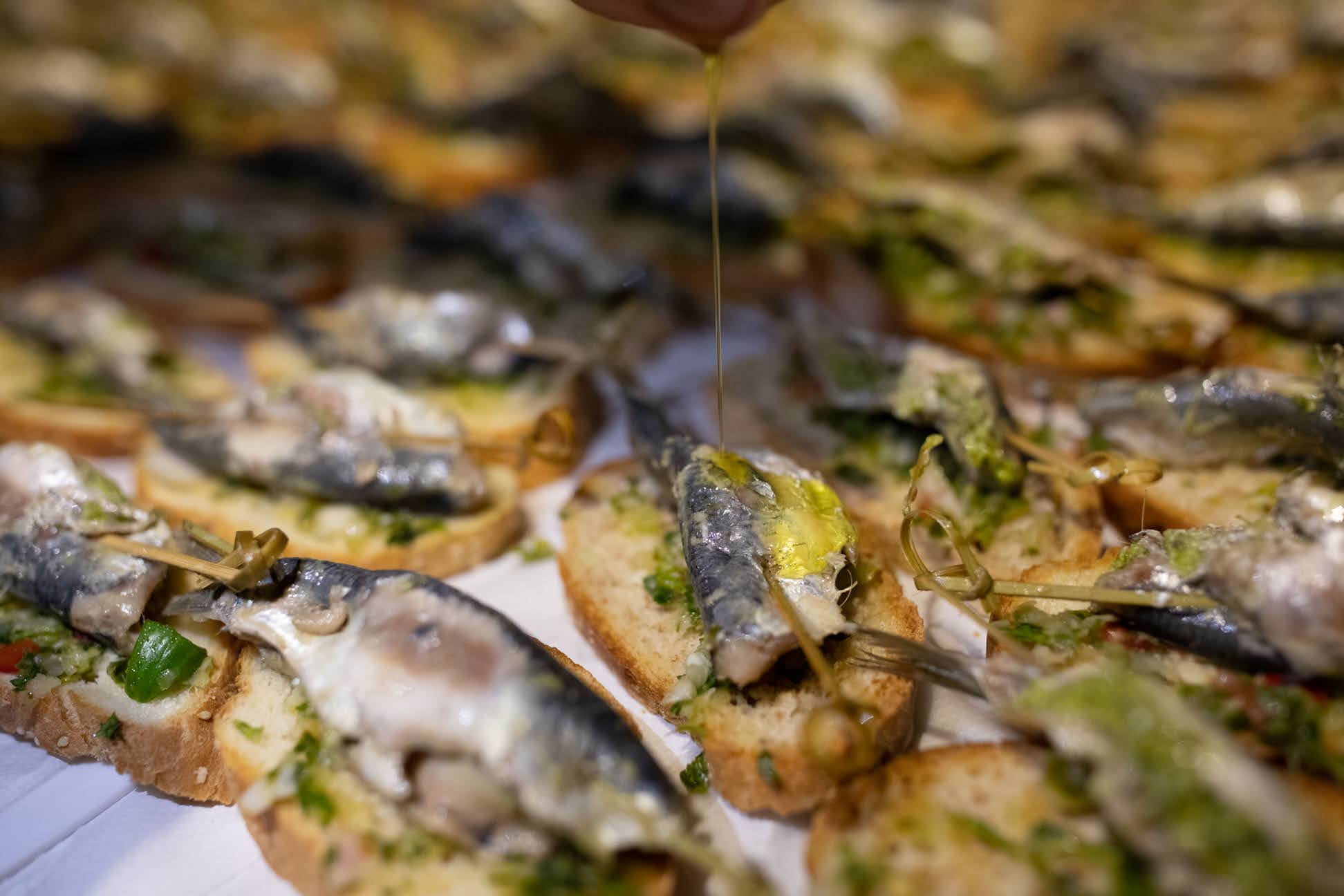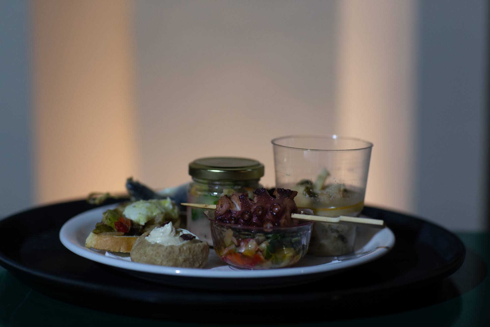 Glass with marinated scorpionfish, vegetables, and olive oil