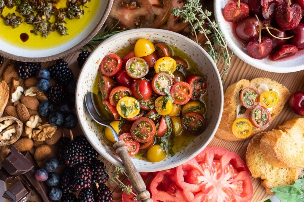Bruschetta Board with Honey-Sweetened Pickled Cherries, Marinated Cherry Tomatoes, Apricot Salsa and Olive Oil Dip